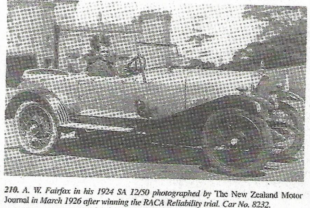 Subsequent History as known to the Alvis Register Pre-War: The Register's records on this car are very sketchy and incomplete, but TVA2 records that the car was owned when new by Alfred W Fairfax (who we believe had served as a Motor Driver in Europe in WW1, and was the second owner of a Morgan-bodied 10-30 which is thought to have been the earliest Alvis to be imported into Australia). He seems to have had an association with the Sydney Alvis agents, Williams Bros Ltd, and competed in a number of road trials and similar competitions with some success, which brought useful publicity for the agents. There are one or two references to this in TVA2. Note especially p392 which records that Fairfax took third place in one of the handicap races at the opening meeting at Maroubra Speedway on 5 December 1925. Other references tell that in March 1926 he won the RACA Reliability Trial (see copy photo (with incorrect caption), and that in November of that year (by which time it seems that the car had been fitted with a lighter 2-seater body) he won his class and came second overall in another unidentified trial. There seems to be a suggestion that by this time the car had been fitted with a lighter 2-seater body.