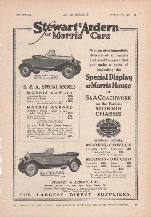 Kimber’s next car was a Chummy body on the Morris Oxford chassis followed by a saloon on the 14/28 Oxford chassis. This was advertised in the first issue of ‘The Morris Owner’ magazine in March 1924 as the MG V-front saloon. This was the first use of the MG name, and two months later the Raworth bodied Cowley was advertised as the “MG Super Sports Morris”. During 1924 Kimber built at least two special cars to individual order. One had a polished aluminium four-seater body by Carbodies, with discs covering the ugly artillery wheels. Built for trials driver Billy Cooper on the 14/28 Oxford chassis, it attracted a lot of attention at Brooklands and elsewhere, leading to request for replicas. At least 13 had been made by October 1924, when a longer wheelbase Oxford enabled better looking cars to be made. Kimber’s advertising referred to them as MGs though the Press tempted to call them Special Bodied Morrises, a practice that continued for some time.