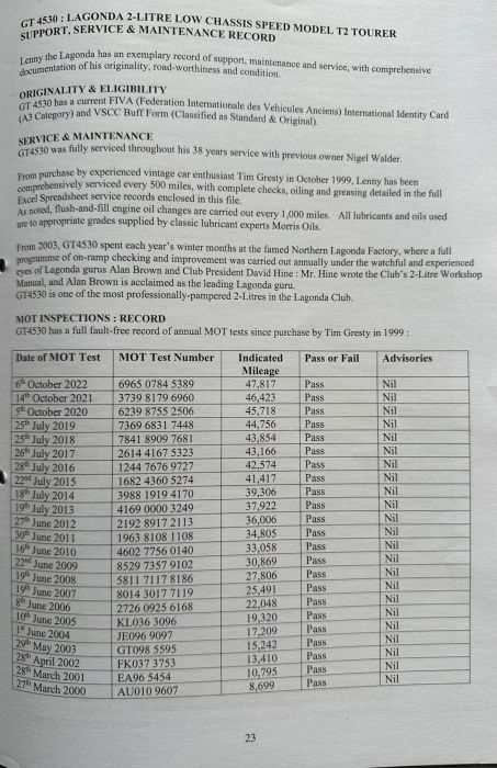 The very highest quality restoration was carried out by 1999 by the late engineer owner, Nigel Walder. Please see photo of Nigel Walder’s impeccable service record from 38 years’s ownership to 1999, drawn up by Tim Gresty, well known in Lagonda circles, following his 24 years of ownership from 1999 to 2023. See also photos included of the present fastidious owner’s service record....