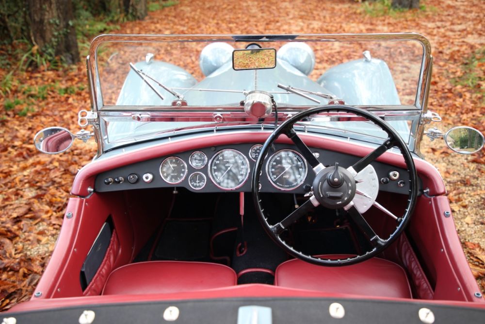 All the top quality instruments are by Jaeger – clock, water temperature, oil pressure, including the chronometric speedo and rev counter, with Lucas ammeter, were sourced and then restored by Chris Clarke of Derby, with the dashboard cut out & fitted to original design by the owner.