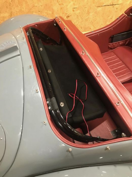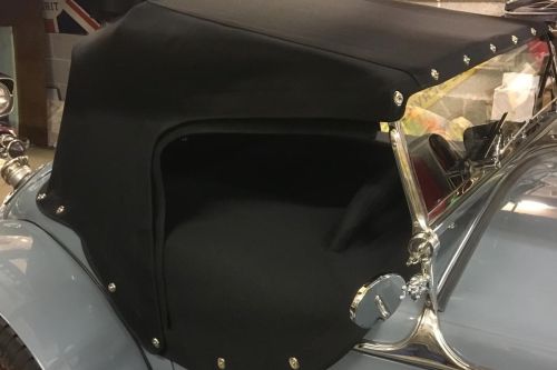 An intricate and clever fold away hood frame is located under the rear tonneau together with the hood which attaches to the studs located across the front edge of the windscreen. Included are wind deflectors to both sides of the windscreen as well as location points in both door tops for side screens if a purchaser should so wish to fabricate them